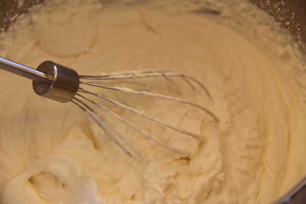 En la mezcla ya fría tazón, batir la crema con un batidor de frío (detección de un tema aquí?) hasta que se espesa y empieza a picos de forma.