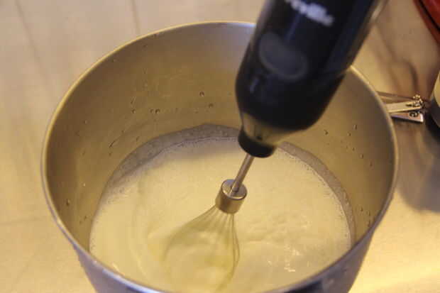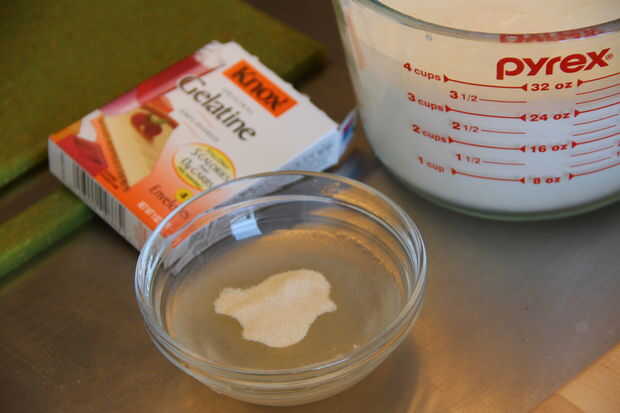 Por lo tanto, estamos haciendo algunos crema batida estabilizada con gelatina. Veggie amigos ahi, agar-agar funciona igual de bien. Otros métodos implican la maicena y batir, pero estoy usando gelatina.