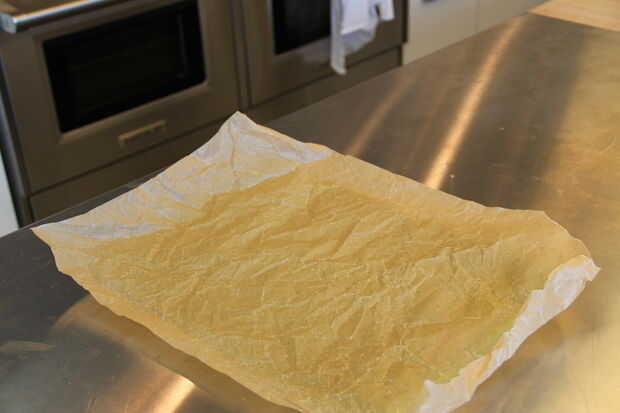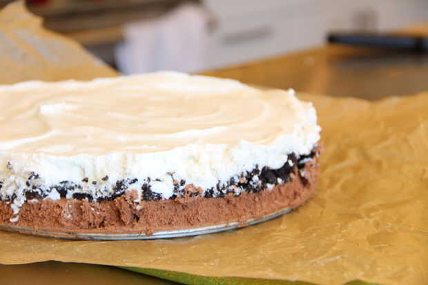 Retire su torta de la tortera y coloque en el papel de pergamino. Está bien si los bordes se mira un poco áspero - que es lo que hiela! Mantenga el springform base debajo de la torta por ahora.