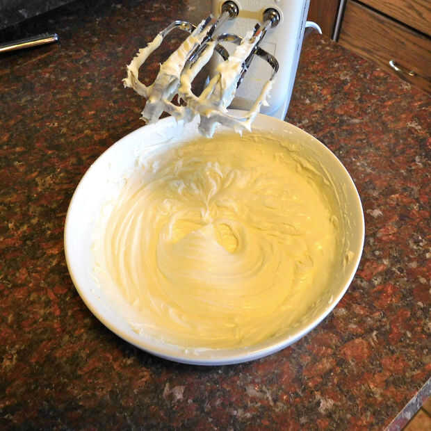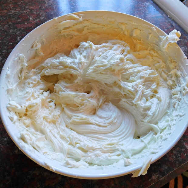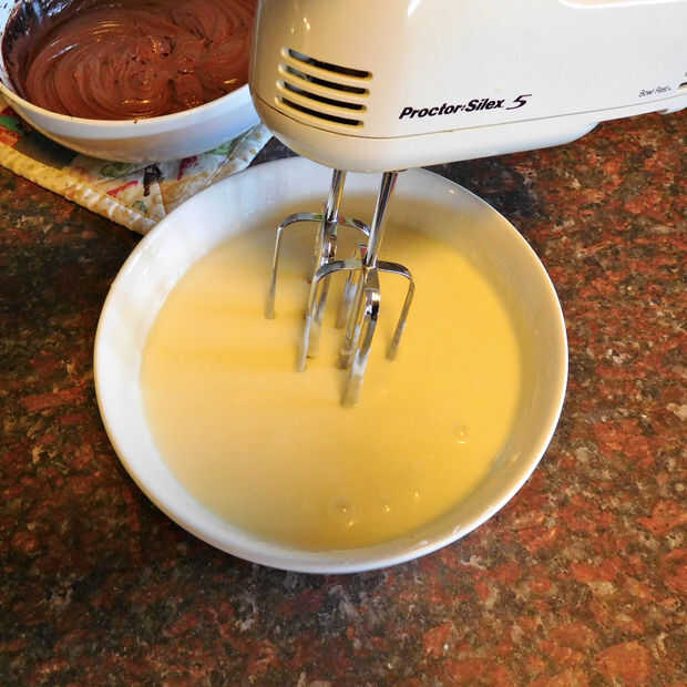 Utilizando una batidora de mano, mezcla ganache hasta que suave y fina. Dejar reposar aproximadamente 30 minutos y mezclar otra vez. Seguir haciendo esto hasta obtener una consistencia de crema batida. Tiempo en esto depende de lo caliente y húmedo es. Si está frío fuera establece el ganache por una ventana para acelerar el proceso. O poner en la nevera durante 15-20 minutos. No trate de usarlo si es delgada. Correrá hacia abajo los lados de su torta y no sonreía.