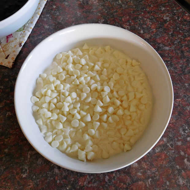 Elegir un sabor o chocolate (blanco, oscuro o de leche) que se asociará mejor con el sabor del pastel. En las siguientes fotos estoy cubriendo un pastel de fresa fresco con ganache de chocolate blanco.