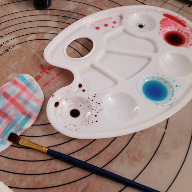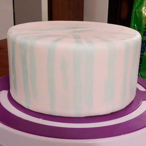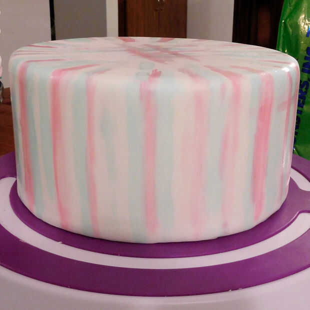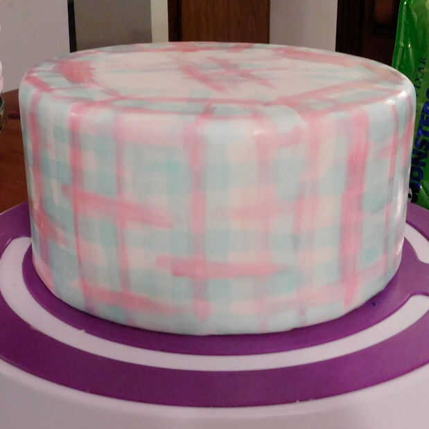 Empezar por elegir un color y pintura de líneas verticales al azar. Limpiar pincel y repetir con el siguiente color. Limpie el cepillo otra vez y pintar las líneas horizontales al azar. Repita con el siguiente color. Si los colores son demasiado pálidos puede ir sobre la torta otra vez una vez que esté completamente seco.