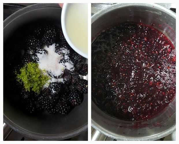 En una cacerola mediana, combine las moras, 1/4 taza de azúcar, la ralladura, jugo y sal. Machaque las bayas totalmente para suelte su jugo y llevar a fuego lento rápido sobre fuego medio-alto. Reducir el calor a medio bajo y cocine a fuego lento durante unos 10 minutos.