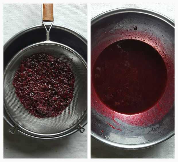 Coloque la mezcla de blackberry a través de un colador de malla fina sobre un tazón de fuente. Usando una espátula de goma, empuje sobre los sólidos de blackberry hasta que se ha extraído todo el líquido; Deseche el contenido del filtro.
