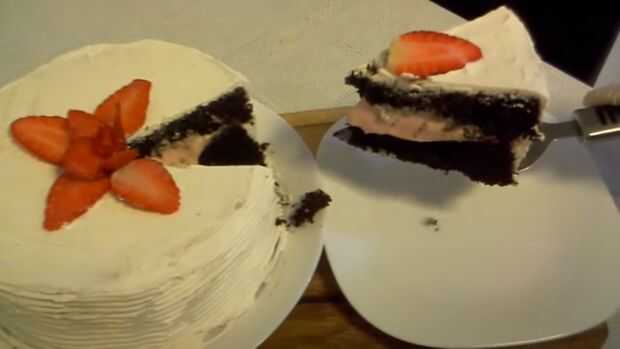 Pastel de chocolate con queso crema y Topping de fresaSabe como se ve tan grande... Mi esposo dijo "fresas en rodajas son sólo parecen pétalos de rosa:)"Para hacer este delicioso pastel, se necesita menos de una hora. Pruébalo, estoy seguro que