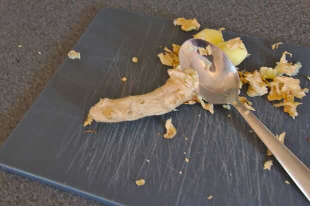 - Pelar la raíz de jengibre. (Con una cuchara. Sí, realmente! Funciona y tiene apenas cualquier basura).