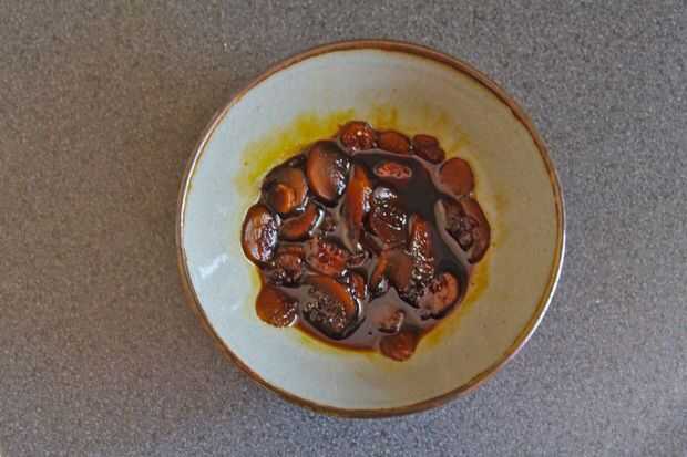 - Una vez que el jengibre es bonito y oscuro y el líquido se ha reducido en al menos la mitad, retire las rodajas de jengibre.