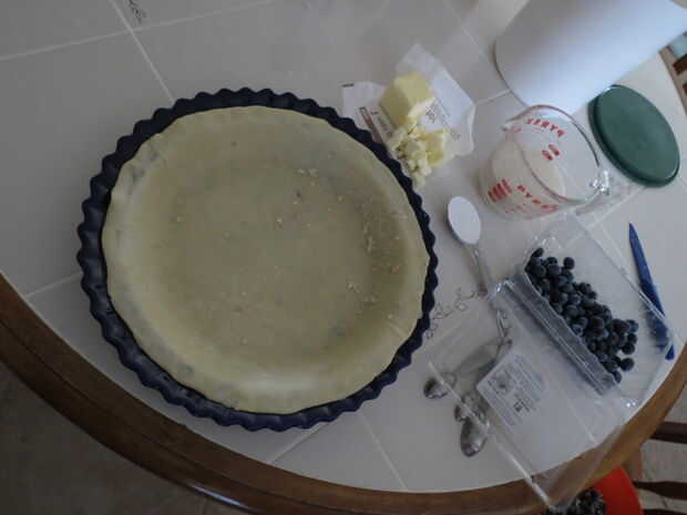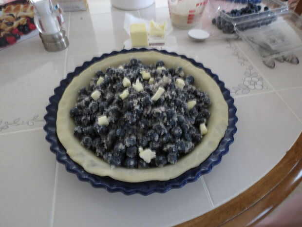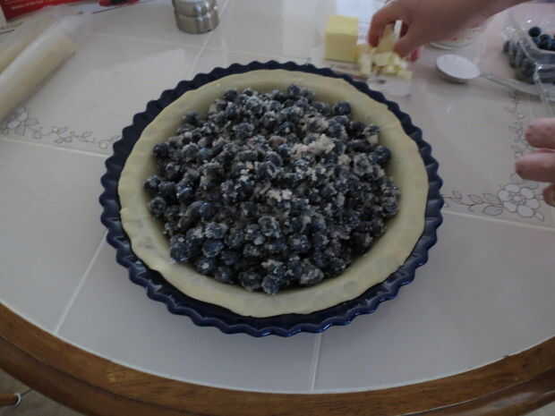 Diseñar una base de tarta en una bandeja de pastel de 9'' y vierta la mezcla de arándanos en la base de la tarta. Cortar pequeños trozos de mantequilla y coloque encima la mezcla de la baya.