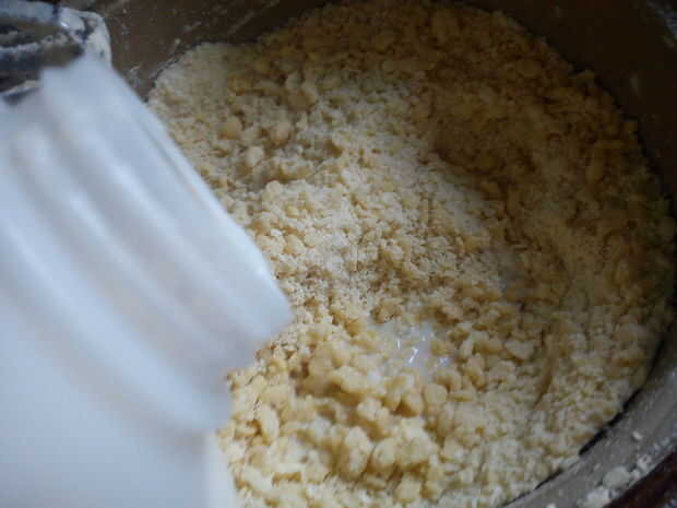 Una vez como migas, añadir el huevo y ligeramente deficiente en la leche (aquí puede batir!: D)