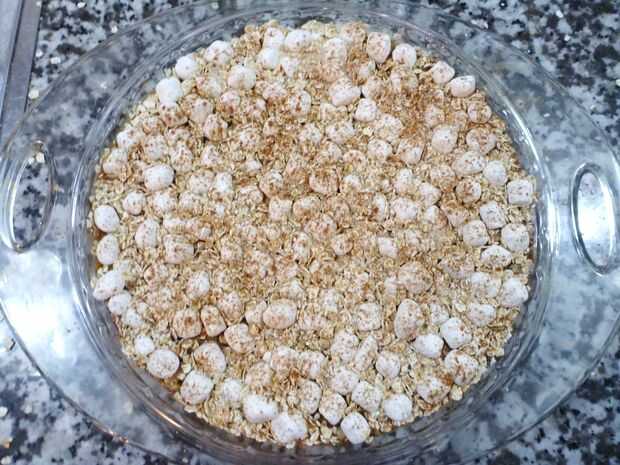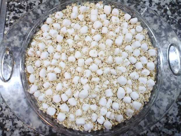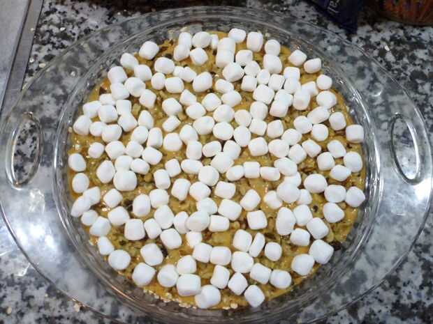 Esparcir nueces picadas sobre pastel, usando lo suficiente como para cubrirlo suficientemente. Luego hacer lo mismo con los malvaviscos pequeños. Espolvorear avena rápida más encima uniformemente, ayudando a reducir el riesgo de las melcochas de la quema y para darle sabor adicional. Polvo ligeramente la parte superior con más canela y un poco de azúcar si lo desea.