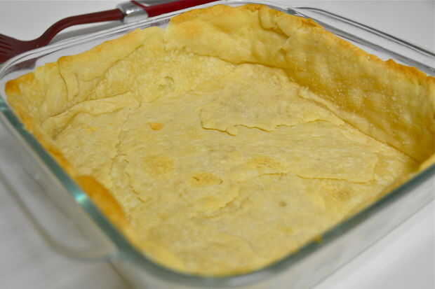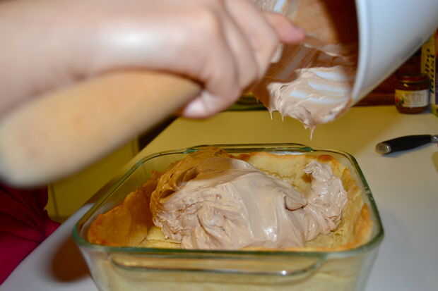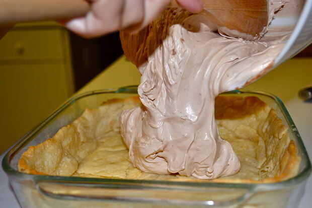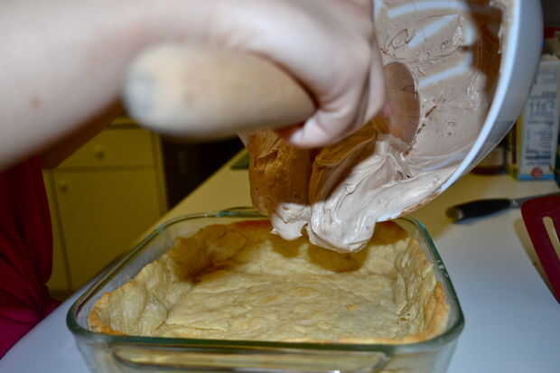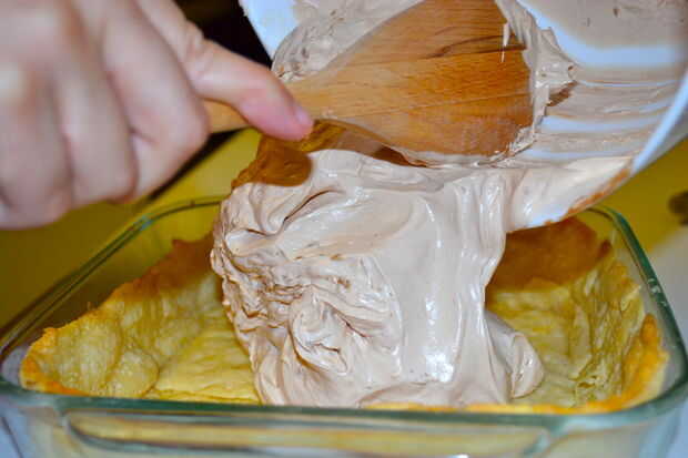 Con una cuchara (hemos utilizado una cuchara de madera), comenzar a verter en la mezcla en la tarta enfriada.