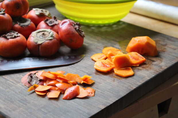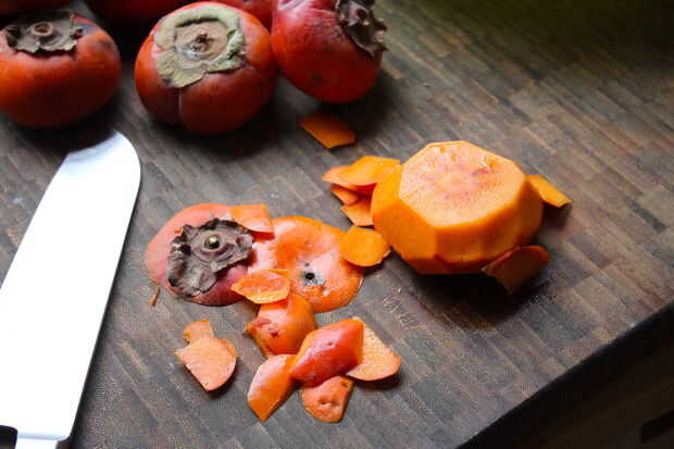 La manera de hacerlo es cortar la parte superior e inferior del caqui y luego hacer pequeños cortes angulares de la parte superior e inferior a la mitad. Esto recorta la piel con el menor esfuerzo. Una vez que hayas hecho esto, toma el cuchillo y recortar alrededor de la mitad - puede haber algunas piezas de piel izquierda!