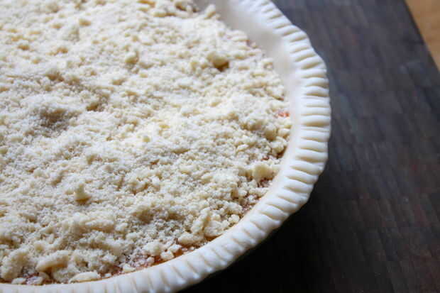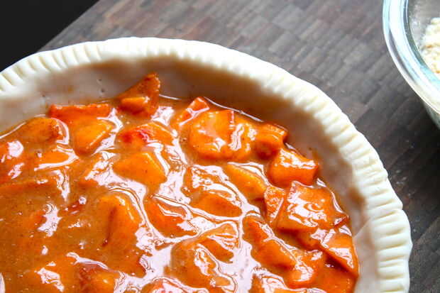 Una vez que la corteza está preparada, verter en la mezcla de caqui y repartidas uniformemente. A continuación, espolvorear encima el crumble.