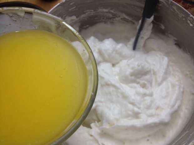 Incorpore la mezcla de harina a combinar, a continuación, doblar en margarina derretida enfriada
