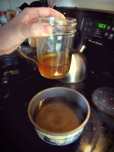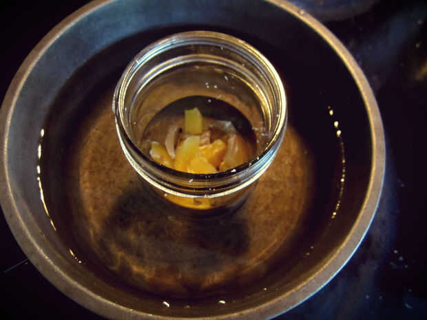 Despedazar su cera de corteza de pastel y añadir los trozos de un pequeño tarro de masón. (Una nota rápida sobre el uso de sus cuchillos de cocina: el cuchillo conseguirá ceroso! Para quitar la cera debe mojar el cuchillo en una olla de agua hirviendo durante un poco. Debido a esto es una buena idea conseguir un cuchillo barato de una tienda de segunda mano y el cuchillo de oficio designado). Llena tu olla de salsa aproximadamente en la mitad y poner el agua a hervir, luego reducir a mitad de camino. Suavemente establecer la jarra llena de cera en la olla y revuelve los trozos de cera que se funden hacia abajo. Utilice su cuchillo para cortar en trozos grandes para acelerar el proceso de fusión. Una vez que la cera se haya derretido, retire la jarra de la olla de la salsa.