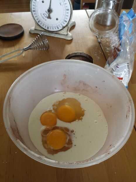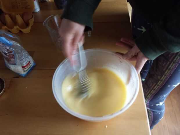 Derretir el aceite de coco (poner el frasco en agua caliente durante un rato) si es sólido y mezclar con la leche, 3 huevos y la vainilla.