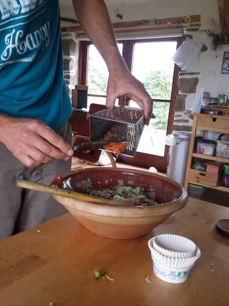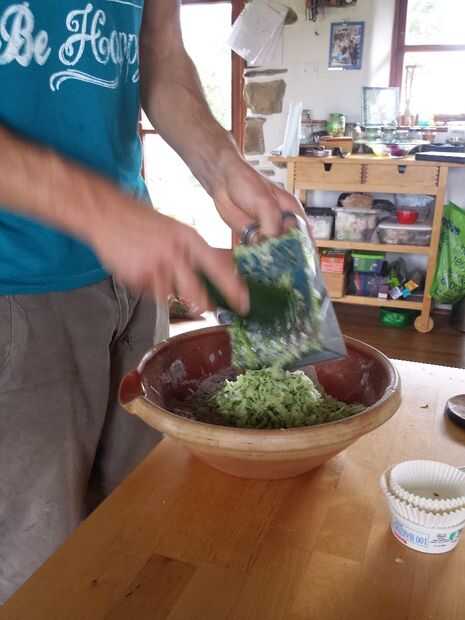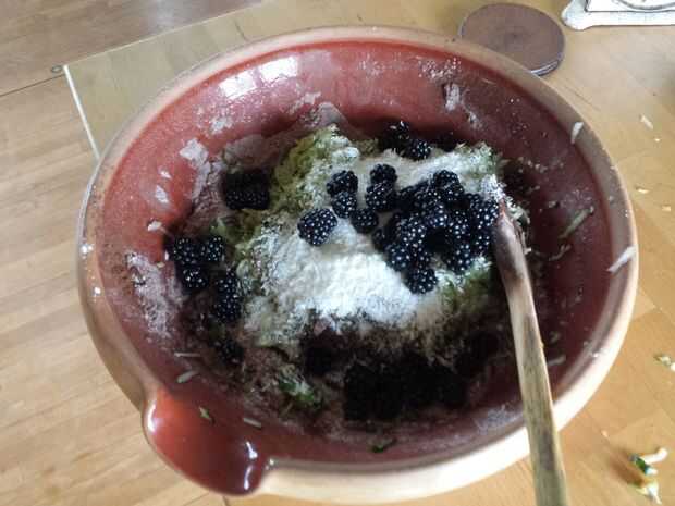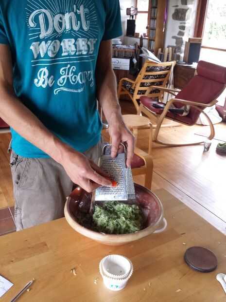 Usamos el lado del recorrido de mayor a grandes el calabacín encima de la mezcla seca.