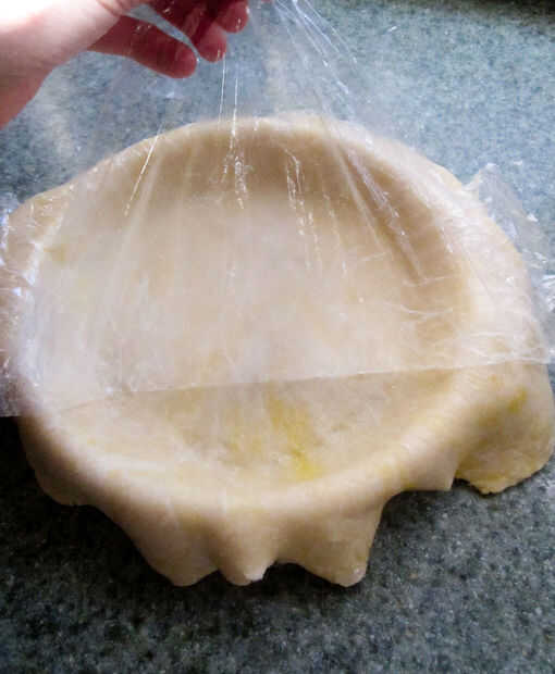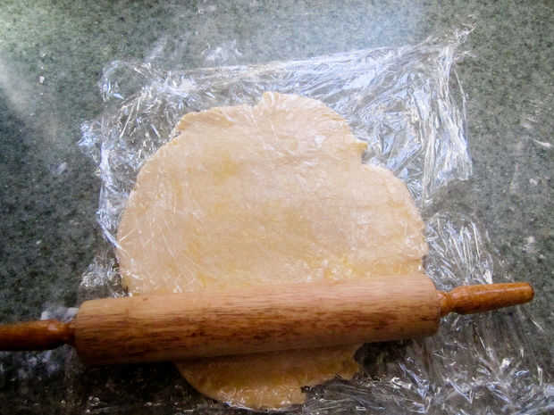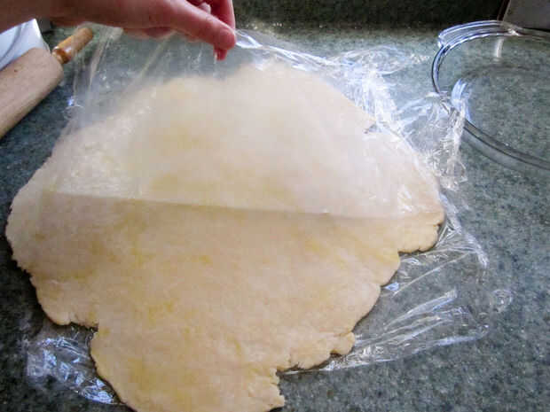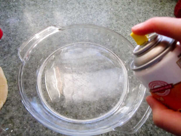 Tomar abrigo de saran de parte superior de la masa, rociar la tartera con aceite de canola y poner la masa en la sartén. Pele el abrigo de saran. Cortar masa extra de perímetro de pan.