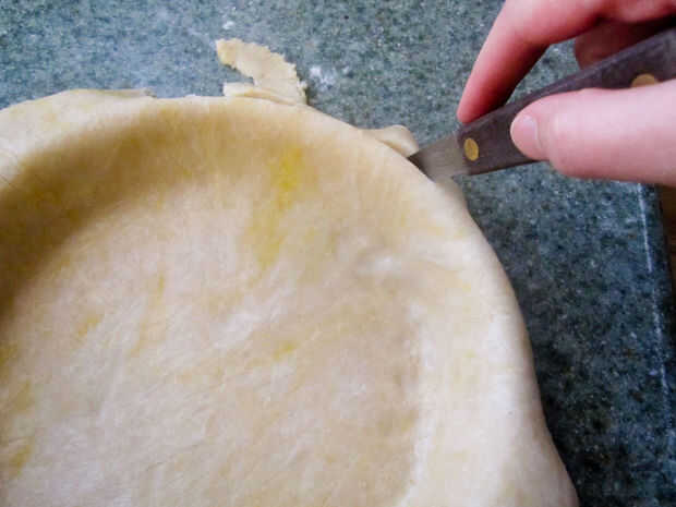 Inferior y lateral de la cáscara del pinchazo todo con un tenedor, luego chill shell 30 minutos. Hornee hasta que el hojaldre está dorado pálido todo. Cáscara fresca.