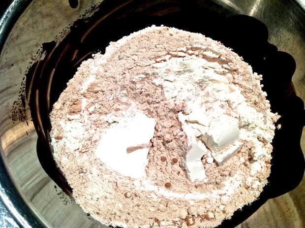 En un mezclador, combine los huevos, la harina y el azúcar, añadir el cacao en polvo y continuar mezclando. A continuación, agregue la mezcla de mantequilla de chocolate. Vierta el relleno en las tartas conchas, o introduce un molde para pasteles estriado con el relleno.
