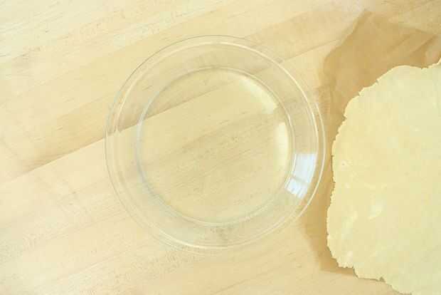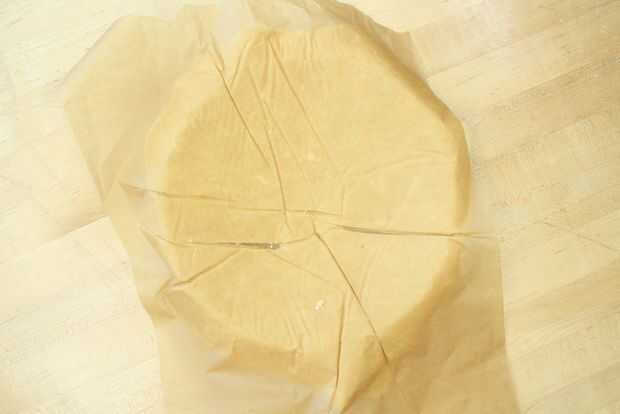 Sacar la hoja superior del pergamino, la hoja inferior se utiliza para transferir la corteza a la cacerola.