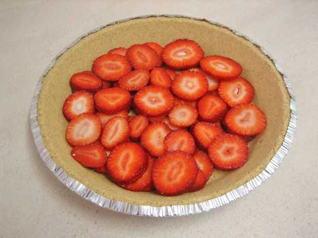 Acomodar rodajas de fresas en la parte inferior de la corteza de galletas Graham de 9 pulgadas
