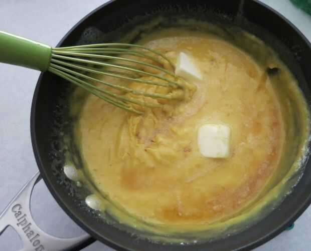 Retire la cacerola del calor; batir mantequilla y brandy. (Si usted ha utilizado vainilla en rama, quitarlo ahora.) Deje que la mezcla se refresca hasta apenas caliente, revolviendo con frecuencia, unos 5 minutos.