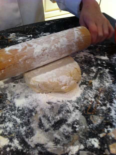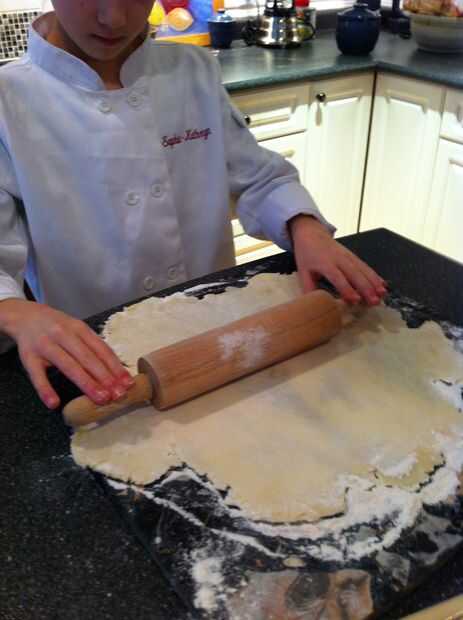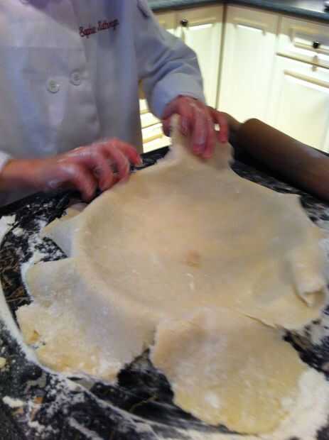 Una vez que la pasta se rueda hacia fuera, levante con cuidado la masa en la tarta.