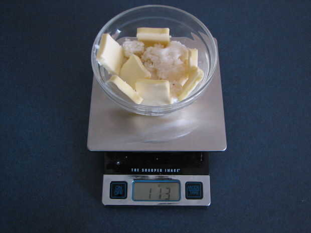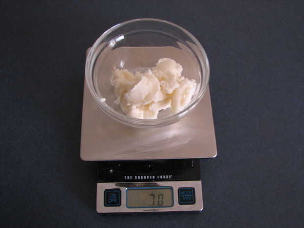 Para esta receta he utilizado el tocino sobrado del proceso de extracto, que produjo 70g. Usé mantequilla para la restantes 43g.