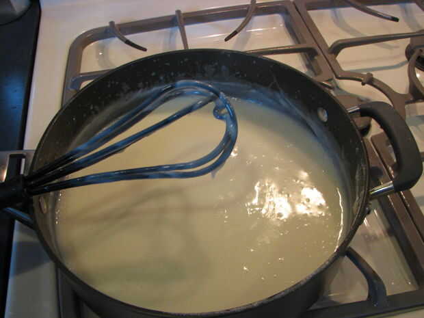 Esto toma cerca de 15m, tiempo durante el cual, necesita estar revolviendo constantemente. Si usted camina lejos, la mezcla espesará irregularmente, dejando los bolsillos del grueso. Si esto sucede, y usted coger temprano, usted puede arreglarlo, pero tienes que trabajar con rapidez. Así que asegúrese de que hacer lo que sea lo que necesitas hacer antes de empezar.