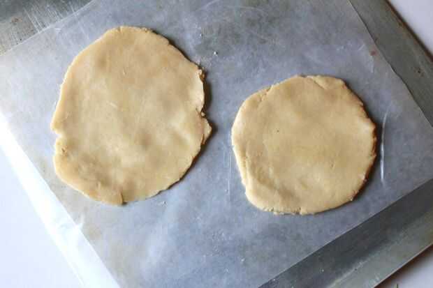Tomar la tarta descongelada y dividida en dos mitades. Ruede cada mitad en forma de bola y proceder a aplanar cada pieza hacia fuera en círculos de 5"- 6"