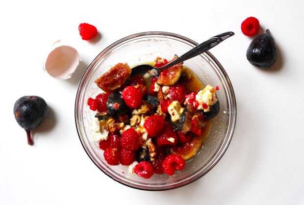 En un recipiente aparte mezclar frambuesas, pep, besos, higos, queso de cabra, azúcar y huevos