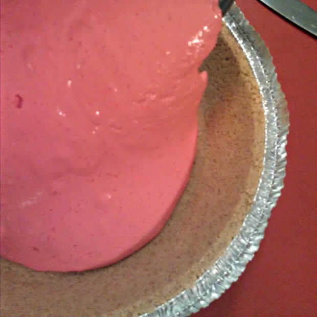 Quitar pie relleno de refrigerador y verter en la costra de galleta.