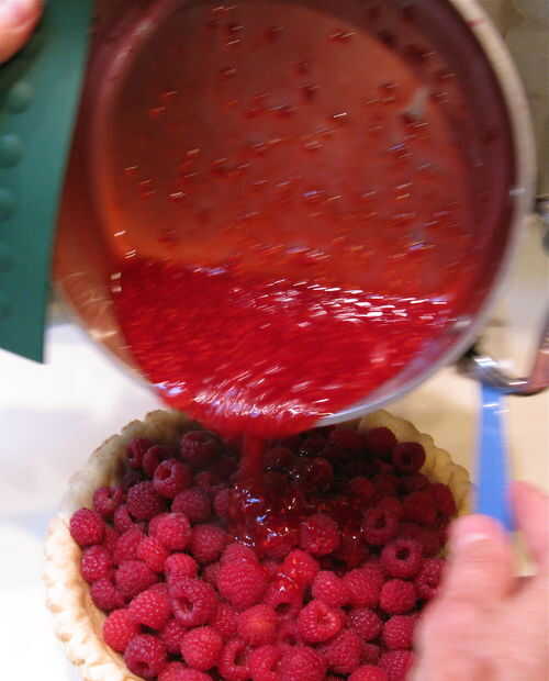 Vierta el glaseado sobre sus bayas, que se separa suavemente para cubrir toda la superficie superior. Deje que el pastel establecer por lo menos 30 minutos en un lugar fresco o en el refrigerador.