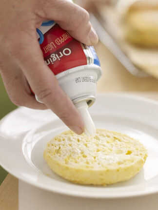 Coloque la parte inferior la mitad en un plato y la parte superior con algunos de la crema batida.