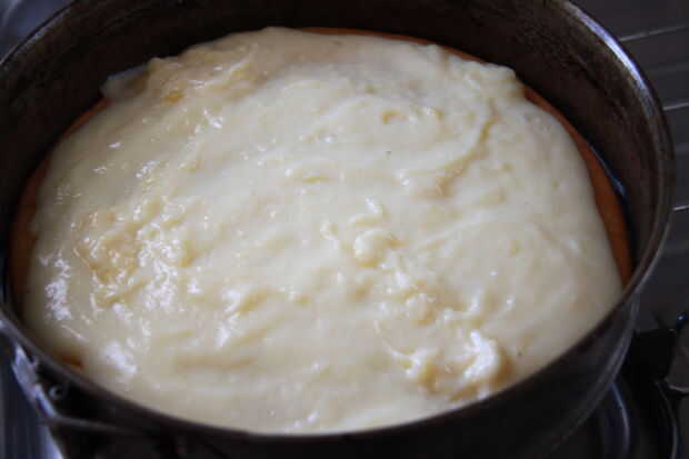 cocinar el budín como escrito en la bolsa y verter sobre el bizcocho enfriado. Cuidado: no tome la galleta de la forma, es necesario que sostenga la natilla. Dejar enfriar completamente.