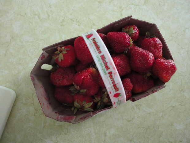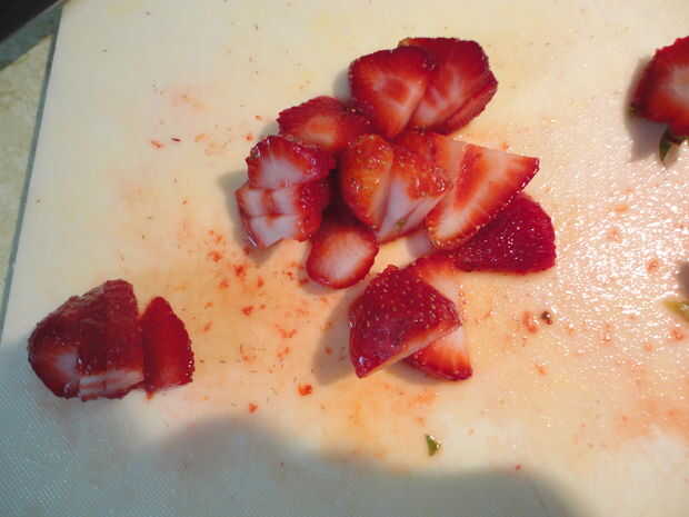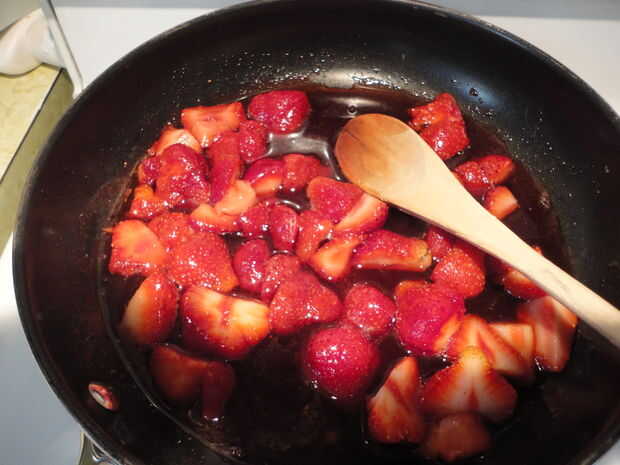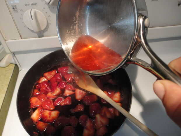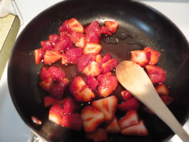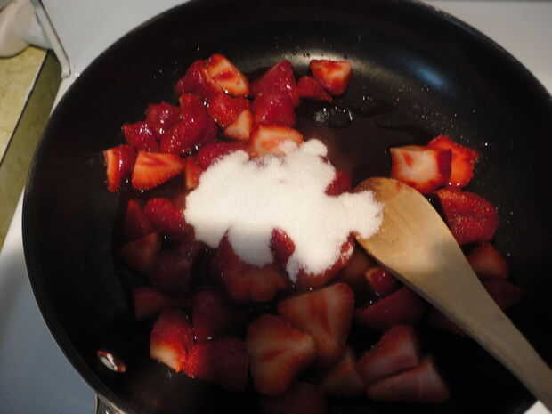 paso 1 - caliente cortar fresas en un cazo a fuego lento con 1/4 taza de azúcar. Las fresas deben liberar parte de sus aguas y suavizar un poco haciendo un bonito coulee o jarabe. Revuelva a menudo. (Podría lanzar esto en la licuadora, cepa y servir el helado... fresa coulee... mmm... pero estamos haciendo un pastel), unos 10 minutos.