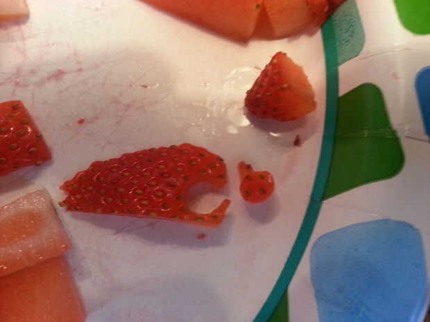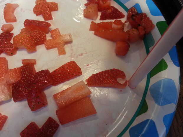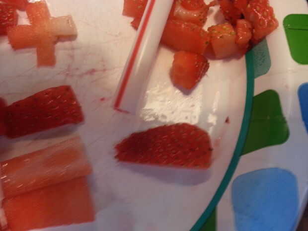 una vez que la paja tenía un pedazo de fresa en él. Después con mucho cuidado sopló en el otro extremo y tiró la pieza de fresa para hacer el signo decimal. (Ver fotos para ver ejemplos). Para menor que y mayor que firmar cualquier piezas que eran grandes suficiente solíamos tallar hacia fuera de las indicaciones. Si no hay grandes piezas suficientes sólo tienes que seguir los mismos pasos que el menos y el signo más.