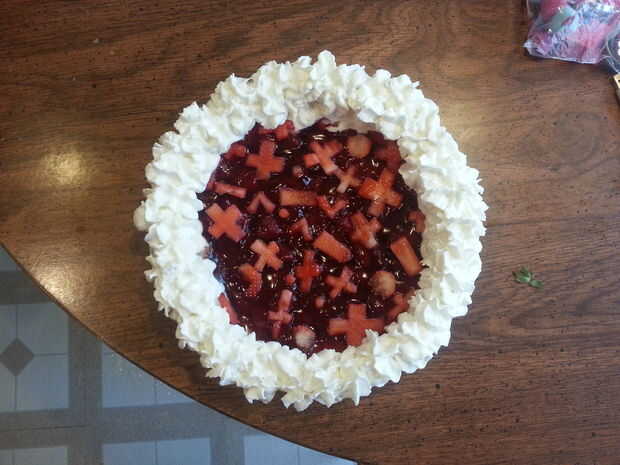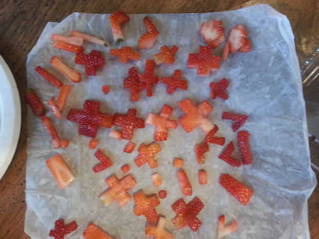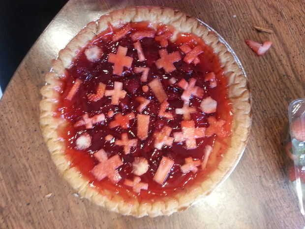 en vez de hacer una tarta de fresa-ruibarbo regular, hice un pastel de ruibarbo (Plaza, que funciona como una "corteza superior") y una tarta de fresas (redonda) y les ensamblado.Si el diámetro del círculo (r) es 1, el área del círculo es 1x1xπ