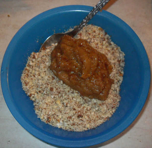 Lo único que tienes que hacer es moler sus tuercas, hacer una "salsa" con las fechas (para 10 minutos) y los higos y luego ponerlos juntos! Pero ten cuidado, no hacen una mezcla "pegajosa". Si esto sucede, sólo tiene que añadir algunos más cucharadas de nueces molidas.