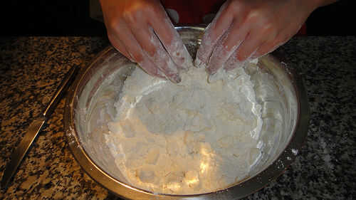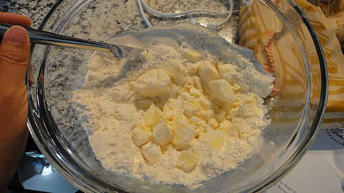 1) cortar la mantequilla fría en trocitos, usando la mano para mezclar en la harina, glaseado de azúcar y leche en polvo