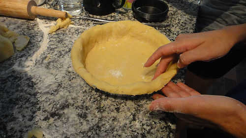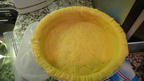 4) enrolle la masa plana y colocarlo en el molde de pastel, utilizar un tenedor para poner los agujeros en la tarta