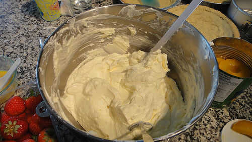 7) Llene la tarta con crema de queso mezcla y decorar con frutas frescas