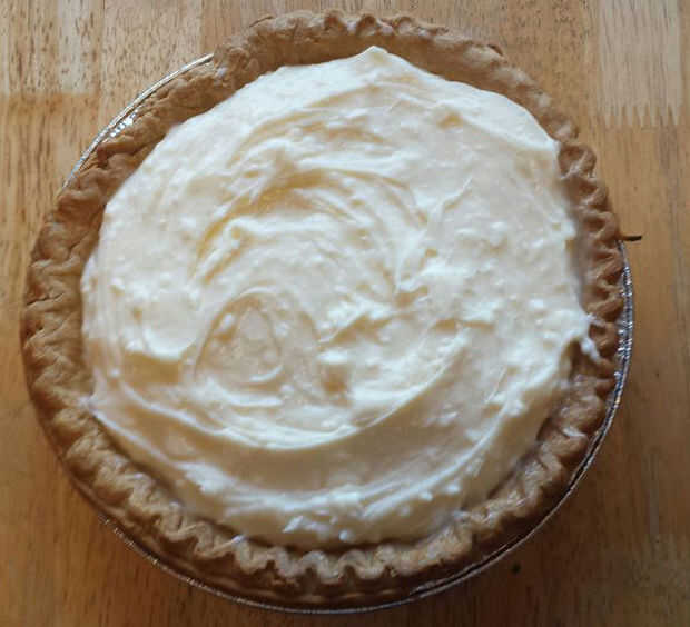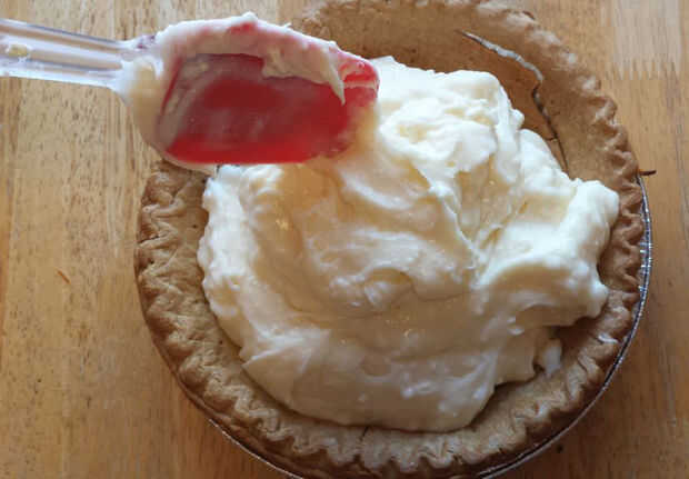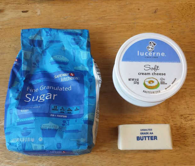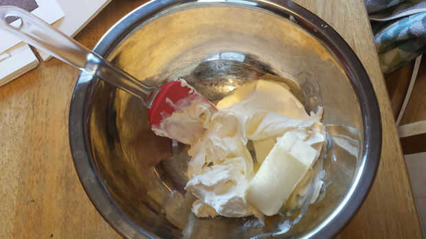 Combina el queso crema y mantequilla en un tazón grande agrega entonces el azúcar un poco a la vez, mezclar bien antes de añadir más. Cuando todo se mezcla, añadí el relleno en la tarta enfriada y aplanado hacia fuera la parte superior con una espátula.