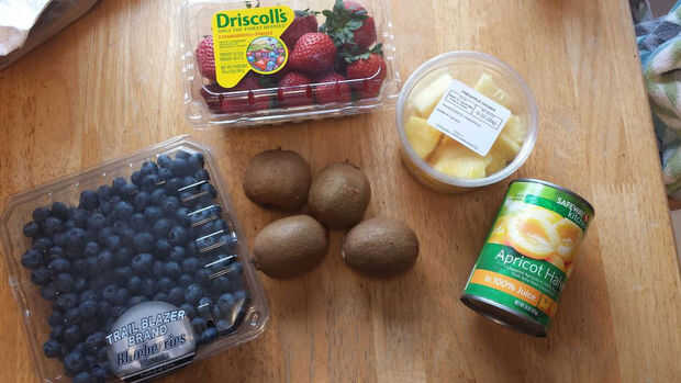 Tuve opciones bastante sólidos para todo excepto la porción de verde azulado, por lo que decidí ir a la tienda y ver cuáles eran mis opciones. Terminé con piñas, fresas, kiwi, arándanos y albaricoques enlatados para la parte naranja. Quería que los frescos, ya que no quiero usar naranjas y los melocotones y nectarinas no naranja bastante. Por supuesto, hubiera preferido que los frescos, pero Safeway no tenía ninguna.