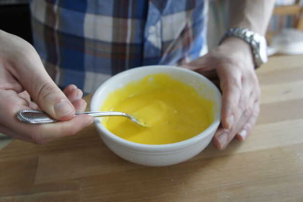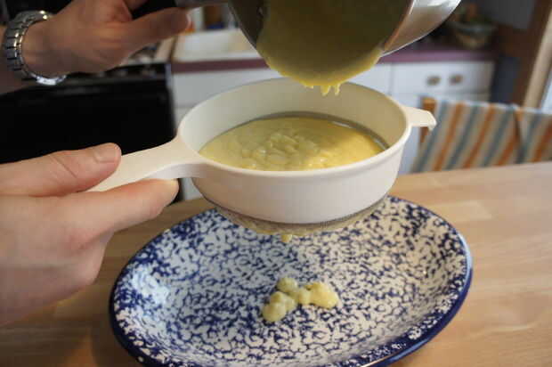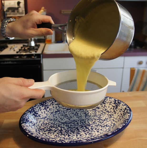 Colar la crema pastelera por un tamiz de malla fina. Puede utilizar una espátula o una cuchara para empujar la crema pastelera a través del acoplamiento.