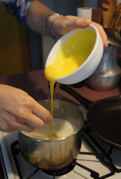 En la estufa, calienta las crema, 6 cucharadas de azúcar y sal en una cacerola sobre fuego medio alto hasta hervir a fuego lento, revolviendo de vez en cuando para disolver el azúcar. Cuando la mezcla de crema ha llegado a hervir, agregue lentamente a la mezcla de yema de huevo, batiendo constantemente.