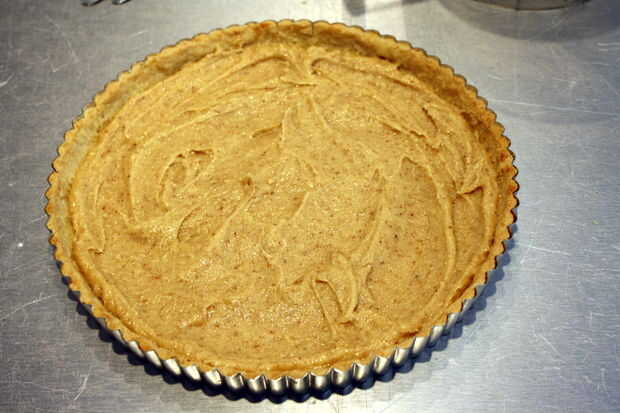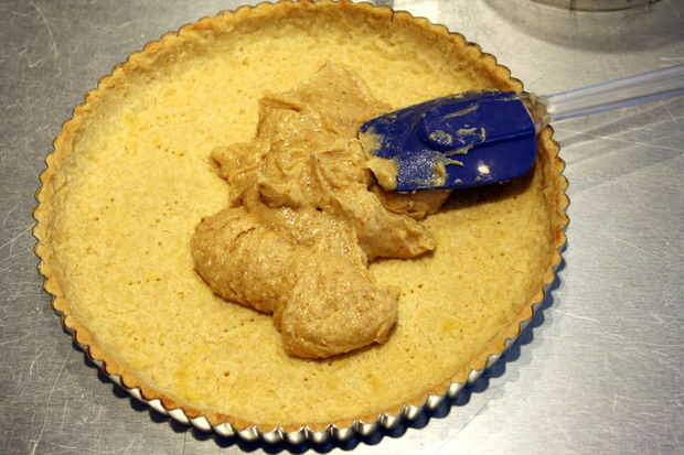 Pala frangipane de relleno en la corteza de tarta horneado y enfriado y lisa uniformemente con una espátula.