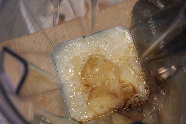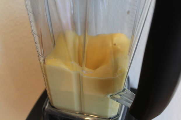 He probado usando una licuadora, razón por la cual tengo fotos de ella; pero fue una mala idea: la masa era demasiado gruesa, y terminé usando un tazón de fuente en su lugar. Por lo que no se confunda con las imágenes ;)
