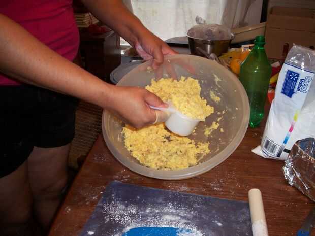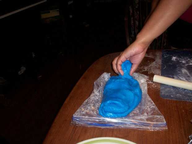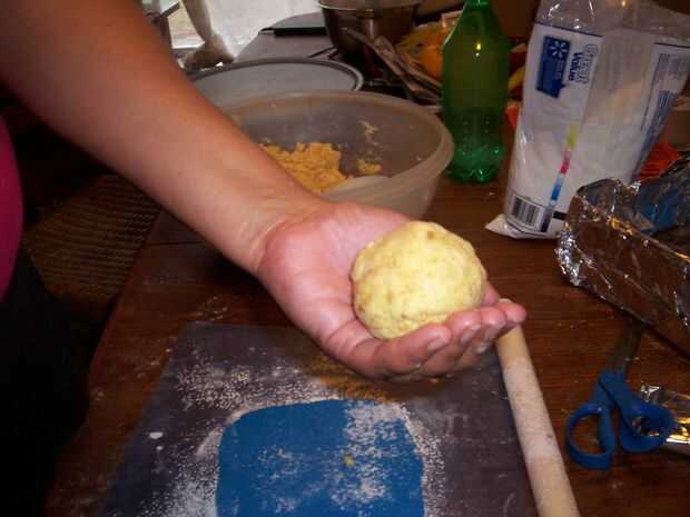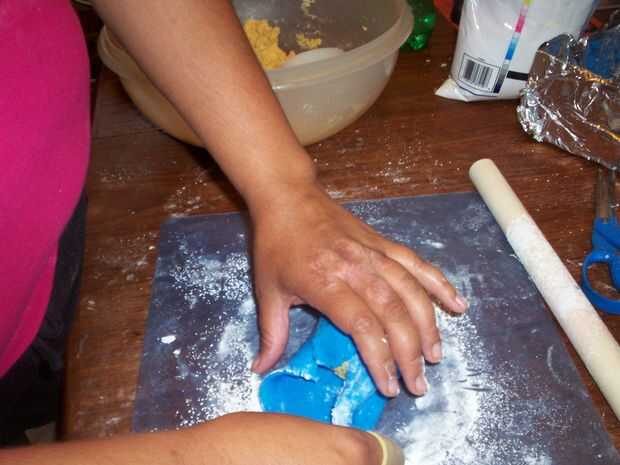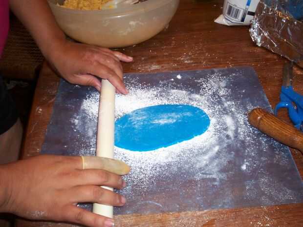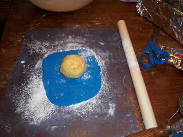 un puñado de la masa de la gota en la estera y rodar hacia fuera a aproximadamente 1/8 a 1/4 de una pulgada de espesor, debe ser cerca de 5 pulgadas a través de